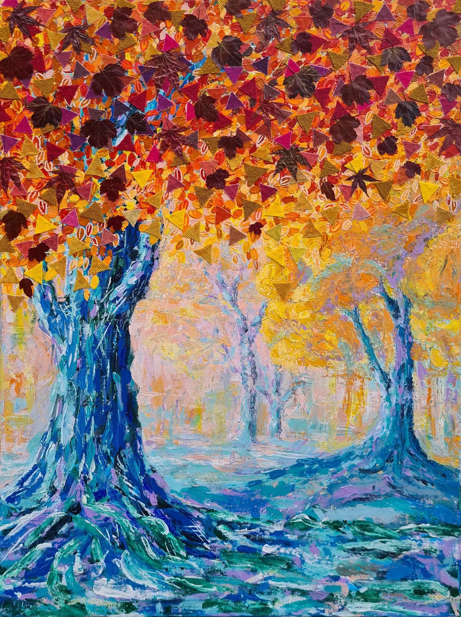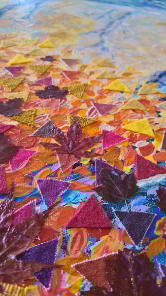 Collage, Acrylic, Marker, textile and dried natural elements.